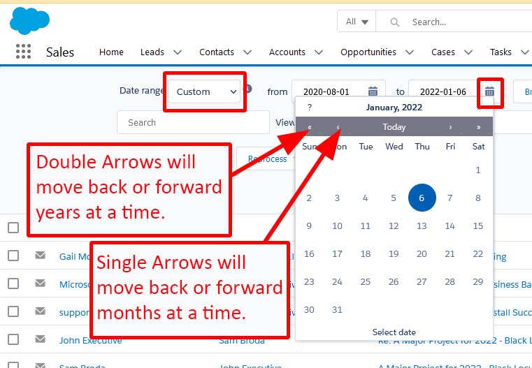Use the single arrows to move backwards or forwards by a month. Use the double arrows to move forwards or backwards by years.