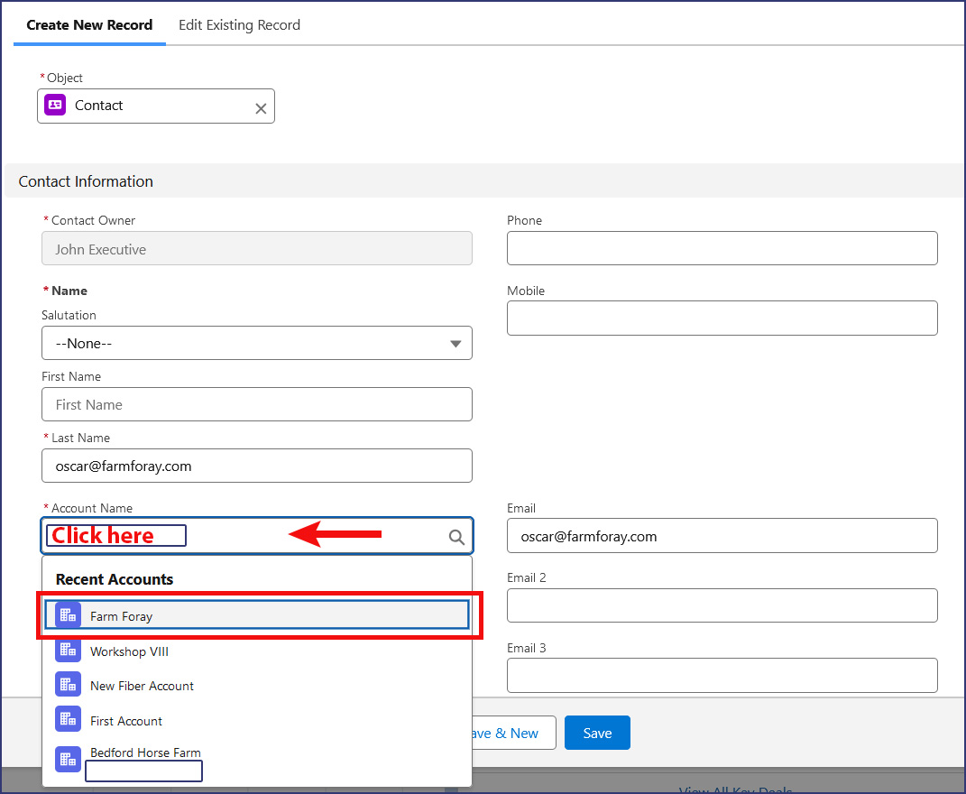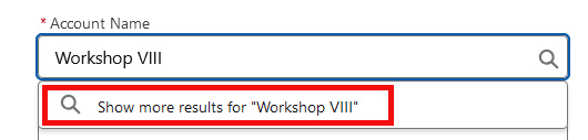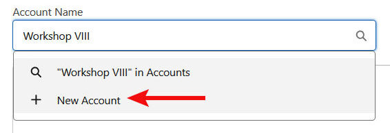 Contacts typically belong to an Account. To also add a new Account, click into the Account Name field. Initially, you will only be presented with existing options. Go ahead and type the Account name in and click “Show more results for …” prompt. In the next pop-up window, click on the Account name as displayed and choose +New Account in drop menu.