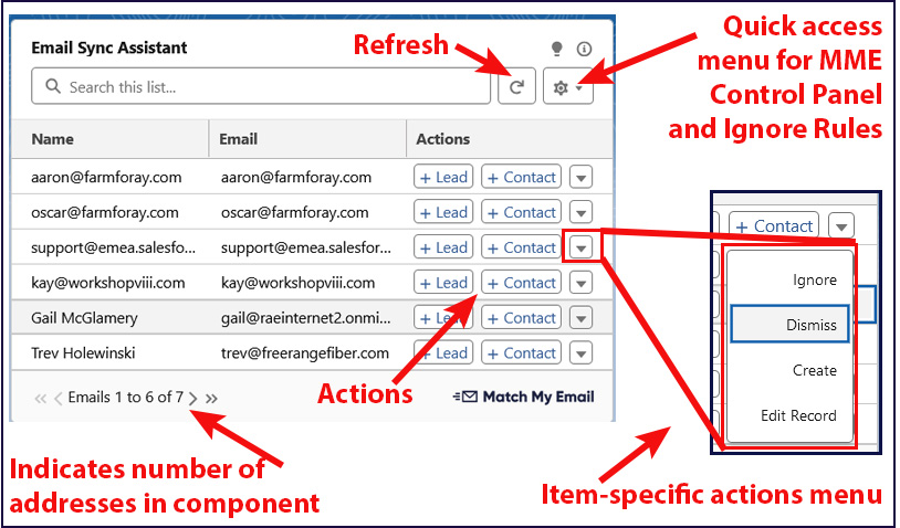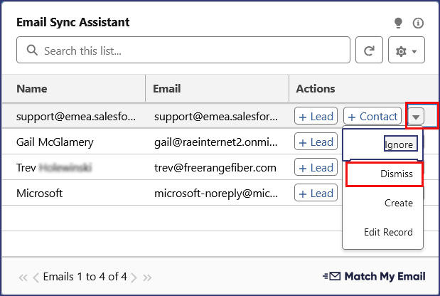 Taking a closer look at the component, it is possible to create a Lead, create a Contact for an existing account, create a Contact and a new Account, create an Ignore rule for the email address or dismiss the listing for later consideration. A User can refresh the list or quickly jump to the Control Panel to check the Ignore list. There is a search field at the top and the ability to advance through listings when there is more than the space allows on the first screen.
