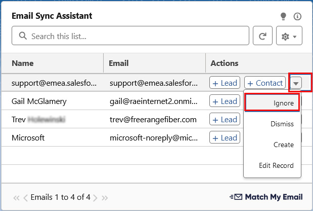 If the individual is someone you will never want to match into Salesforce, you can create an ignore rule. As above, you would click the caret and choose Ignore.