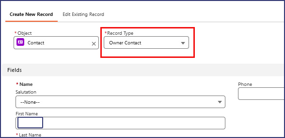 After clicking the +Contact button, in the pop-window we see a similar screen as Lead with a few differences. The Object will show the correct type of object – Contact. The same fields will auto-populate as we saw with a Lead.