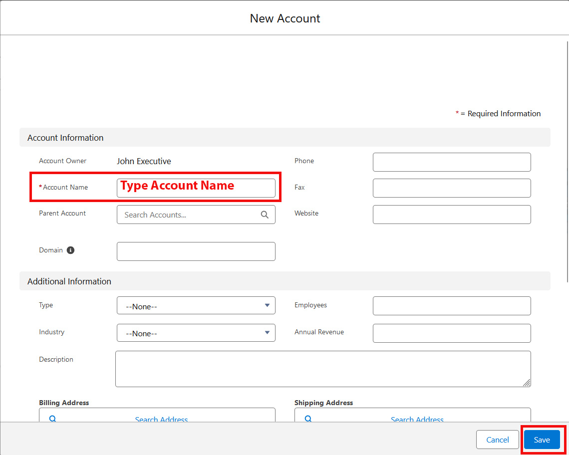 In the New Account form, you will need to type in the name of the Account as you would like it to appear. You will notice there is a red asterisk (*) by this field meaning it is required. If you have other required fields for Accounts, you will see this indicated and would need to fill those in. Then click Save.