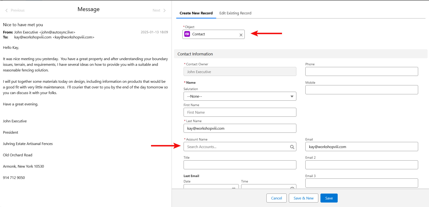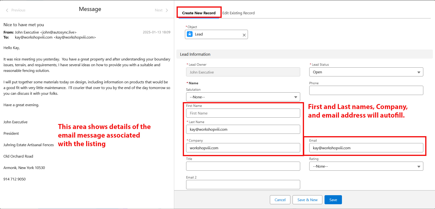 To add someone as a Lead, click the + Lead button next to the listing. For this example, we will create Kay as a new Lead. After clicking the +Lead button next to their listing, we will see a pop up window. The source email message will display on the left. On the right will be the Create New Record tab. Several fields will automatically populate including the Object type, First Name and/or Last Name, Company, and Email address.