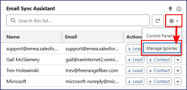 To view or modify ignore rules, such as changing the Ignore Type or the scope of the ignore to include all Users (Admins only), you can click the Email Sync Assistant Setting button and choose Manage Ignores. You may need to follow prompts to login via your Salesforce Credential to arrive at your Control Panel. Then click on Ignores.