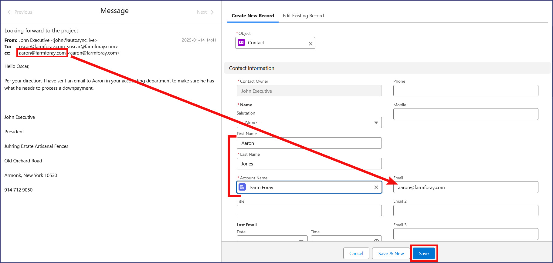 When there is a display name in the email message, our app will normally fill in the First Name and Last Name. When this isn’t the case, as in the screenshot below, the email address will fill into the Last Name by default. You can overwrite this by typing in the correct info or using the email message on the left to copy/paste or select/drag/drop the information in. The Company Name will become the email domain from the email address which, again, you can overwrite. Don’t forget to Save.