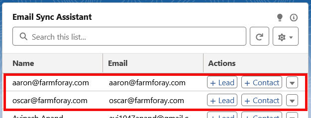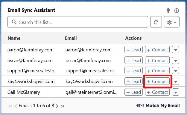 In our sample Email Sync Assistant, we have two individuals that are with the same company. That company already exists in Salesforce. Pick one and click the +Contact button.