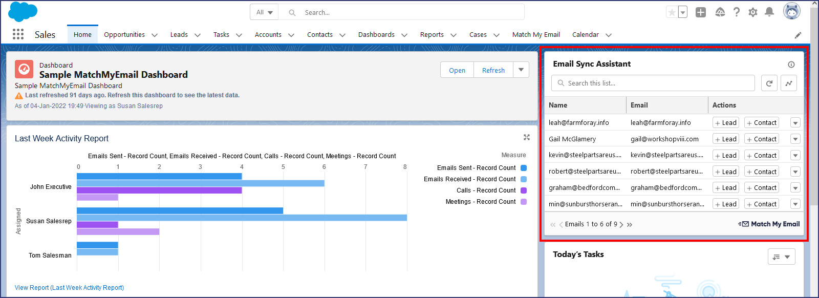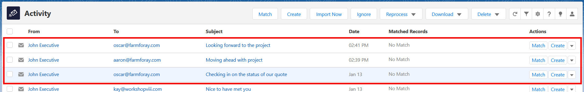 When someone appears in the Email Sync Assistant List, this reflects that there are emails in your Match My Email Activity Dashboard to or from these individuals which we didn’t sync to Salesforce. In the following screenshots, we can see the Email Sync Assistant shows both Oscar and Aaron from Farm Foray. Indeed, there are a few emails in the Match My Email Activity Dashboard that were sent by our User John Executive to them. These have No Match status because neither of these individuals is in Salesforce.