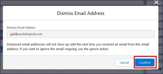 For a listing in which you want to defer a decision, you can use the Dismiss option. Click the caret button and click on the Dismiss option. In the pop-up window, we will display the email address on which you are deferring action. As is stated in the help text, this individual will not show up again in the Email Sync Assistant until you receive another email from this person.